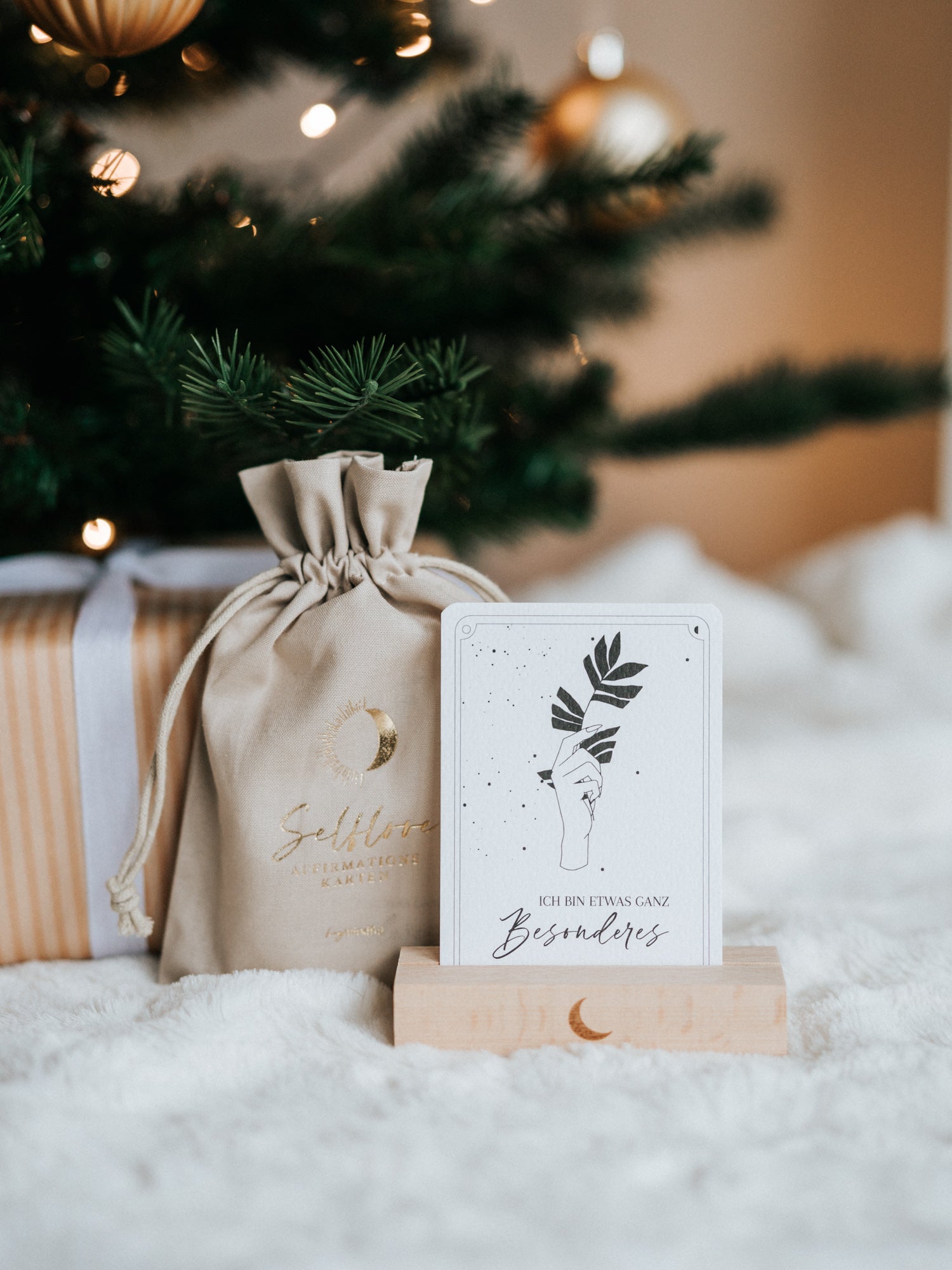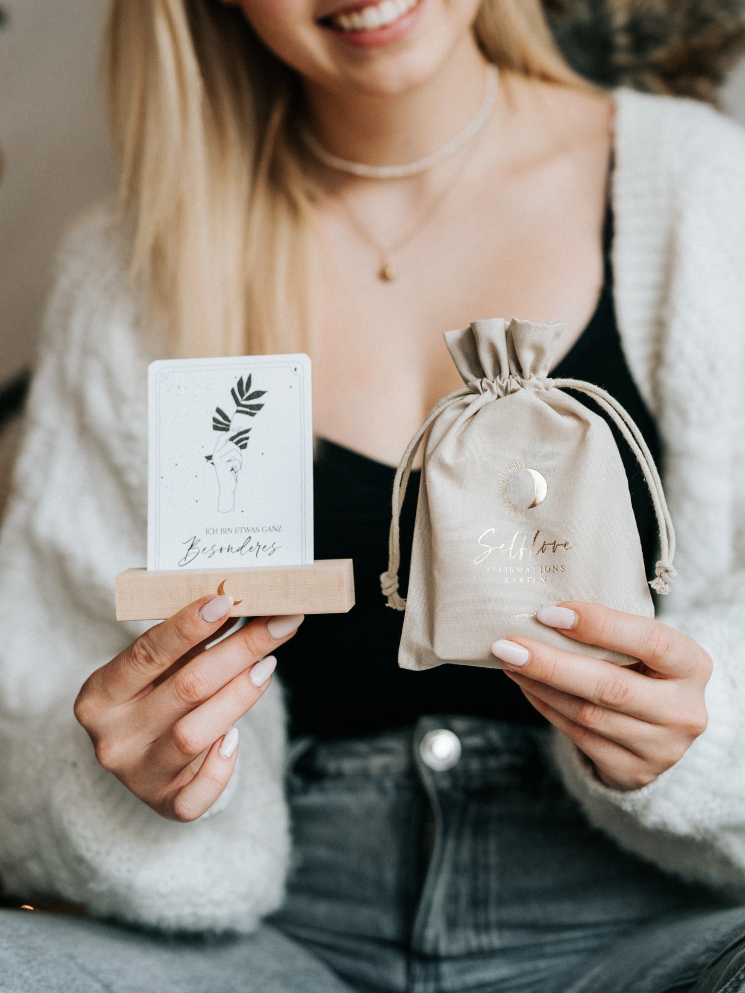 Dein kleiner Reminder für jeden Tag. Die Affirmationskarten schenken dir liebevolle Impulse, der Kartenhalter macht sie sichtbar in deinem Alltag. Ideal für den Schreibtisch, das Nachtkästchen oder deinen Morgenstart. Ein Duo, das dir hilft, einen Moment Pause zu nehmen.