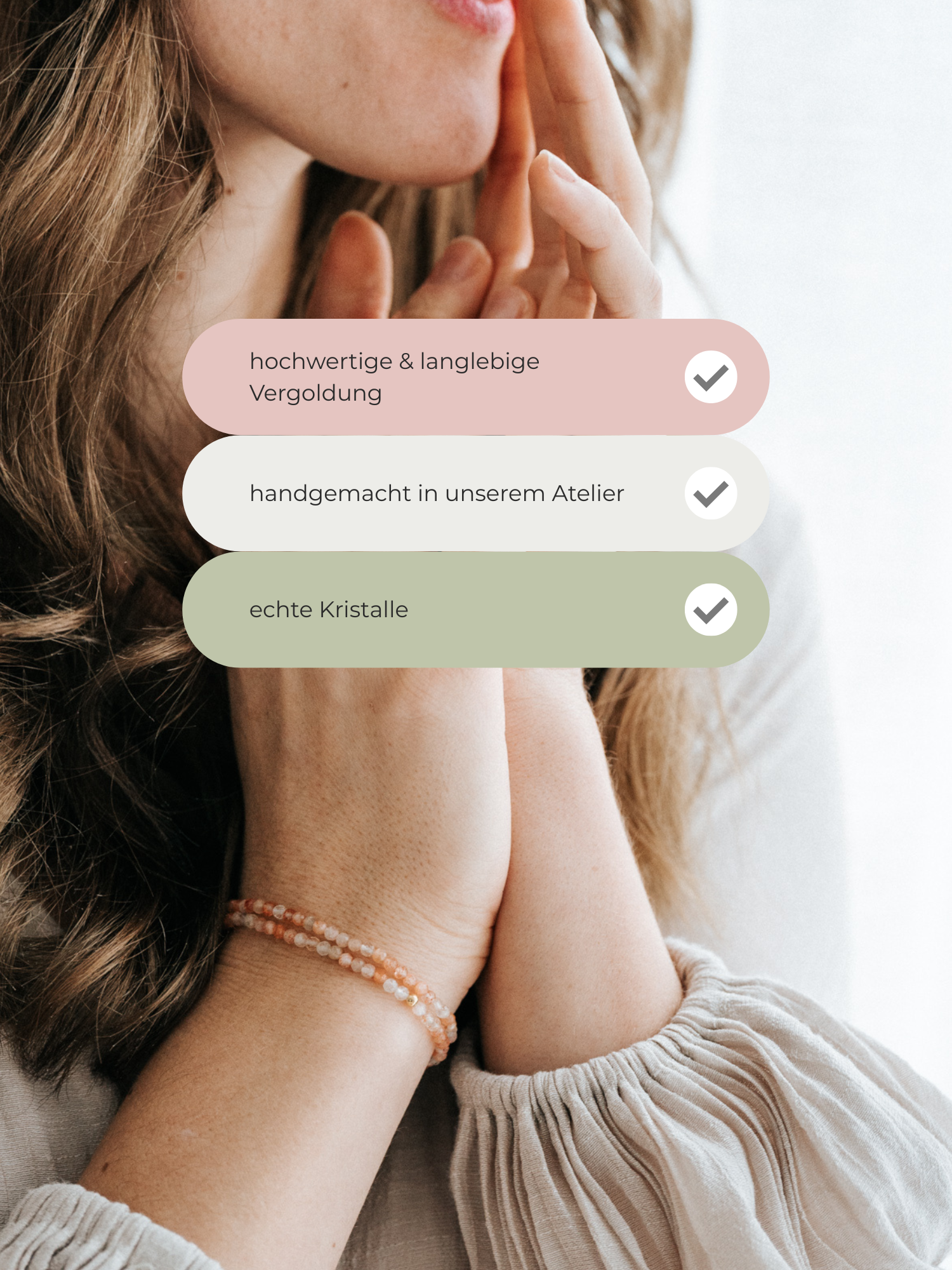 Dein täglicher Begleiter für mehr Verbindung - zu dir selbst und dem, was wirklich zählt. Wir glauben an die Kraft der Natur & arbeiten mit echten Edelsteinen. In jedem Armband steckt ein sorgfältig ausgewählter Kristall, der dich auf deinem Weg unterstützt.
