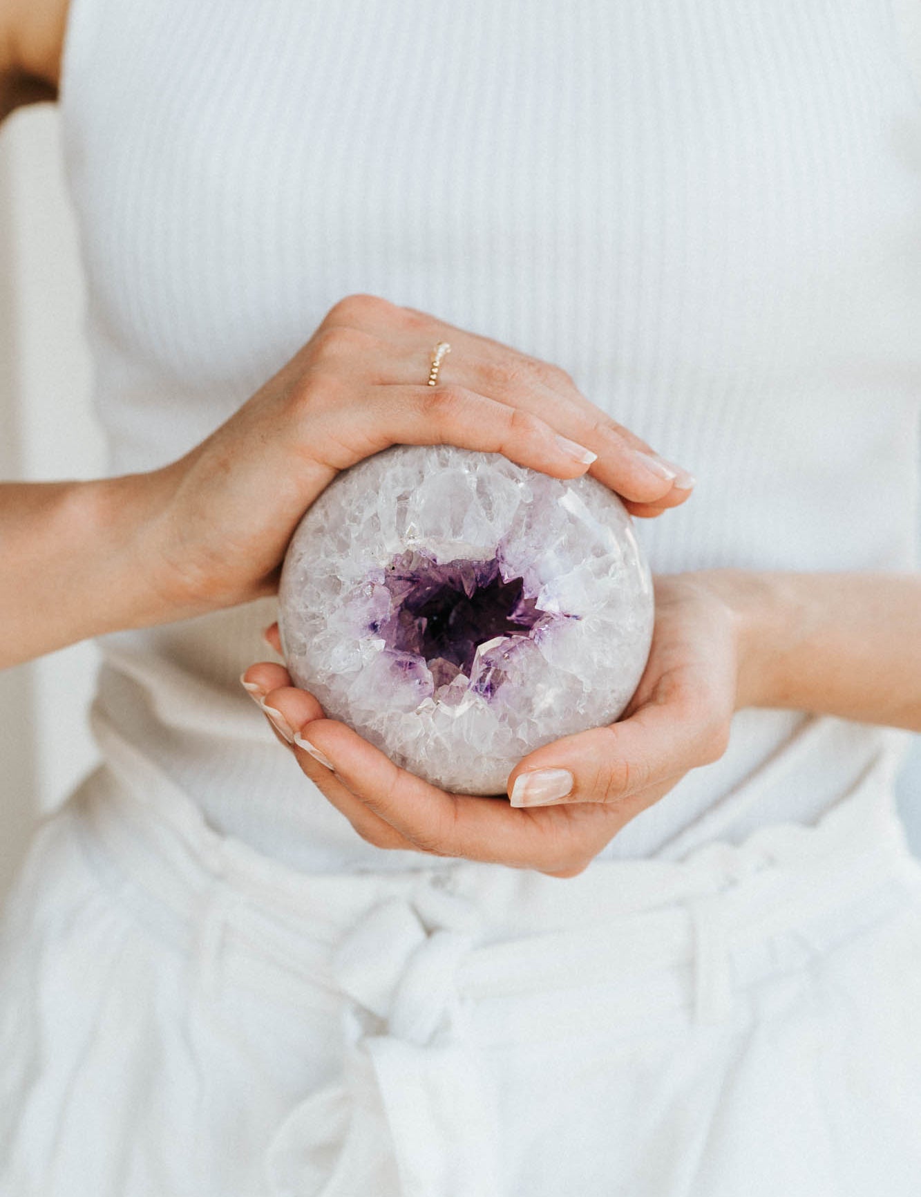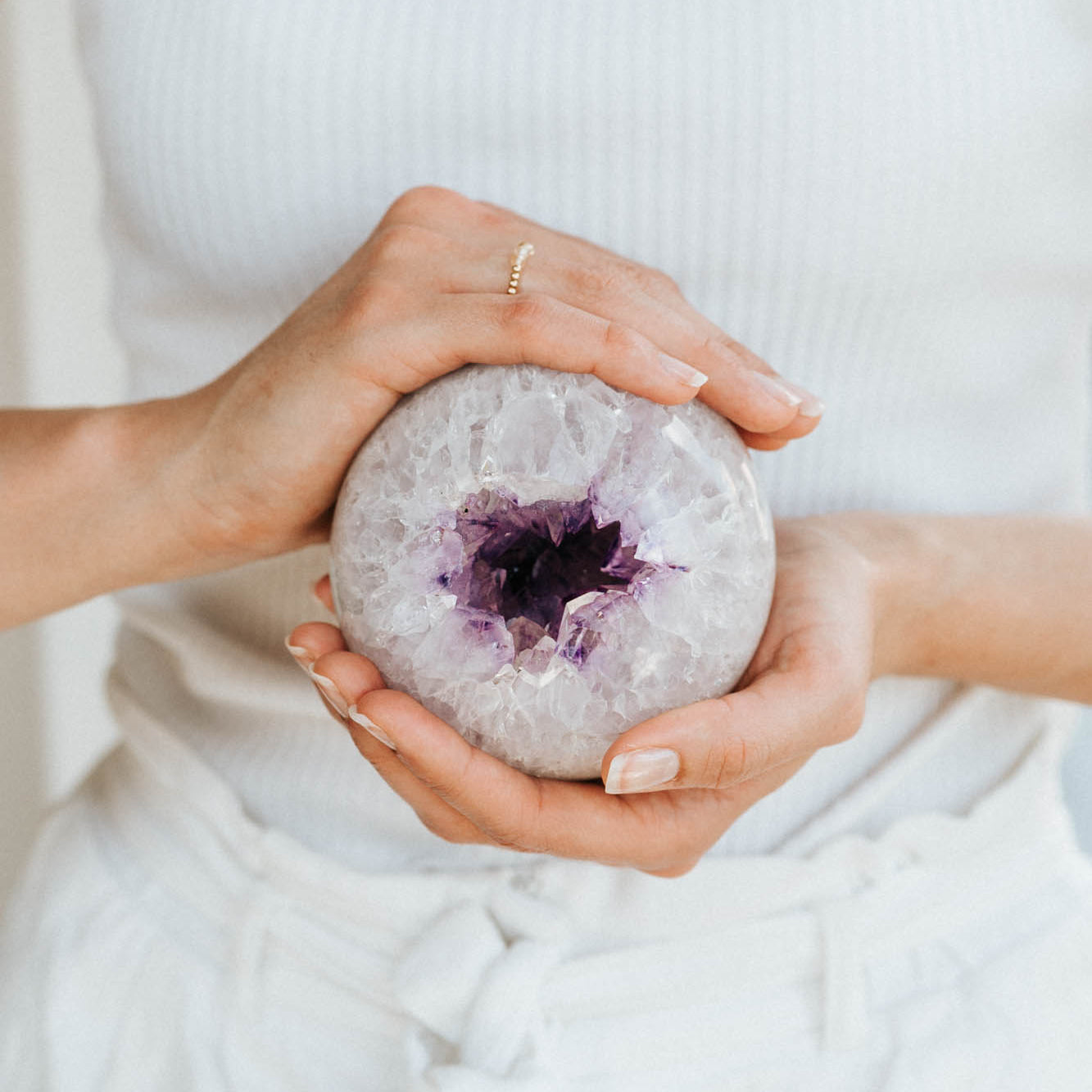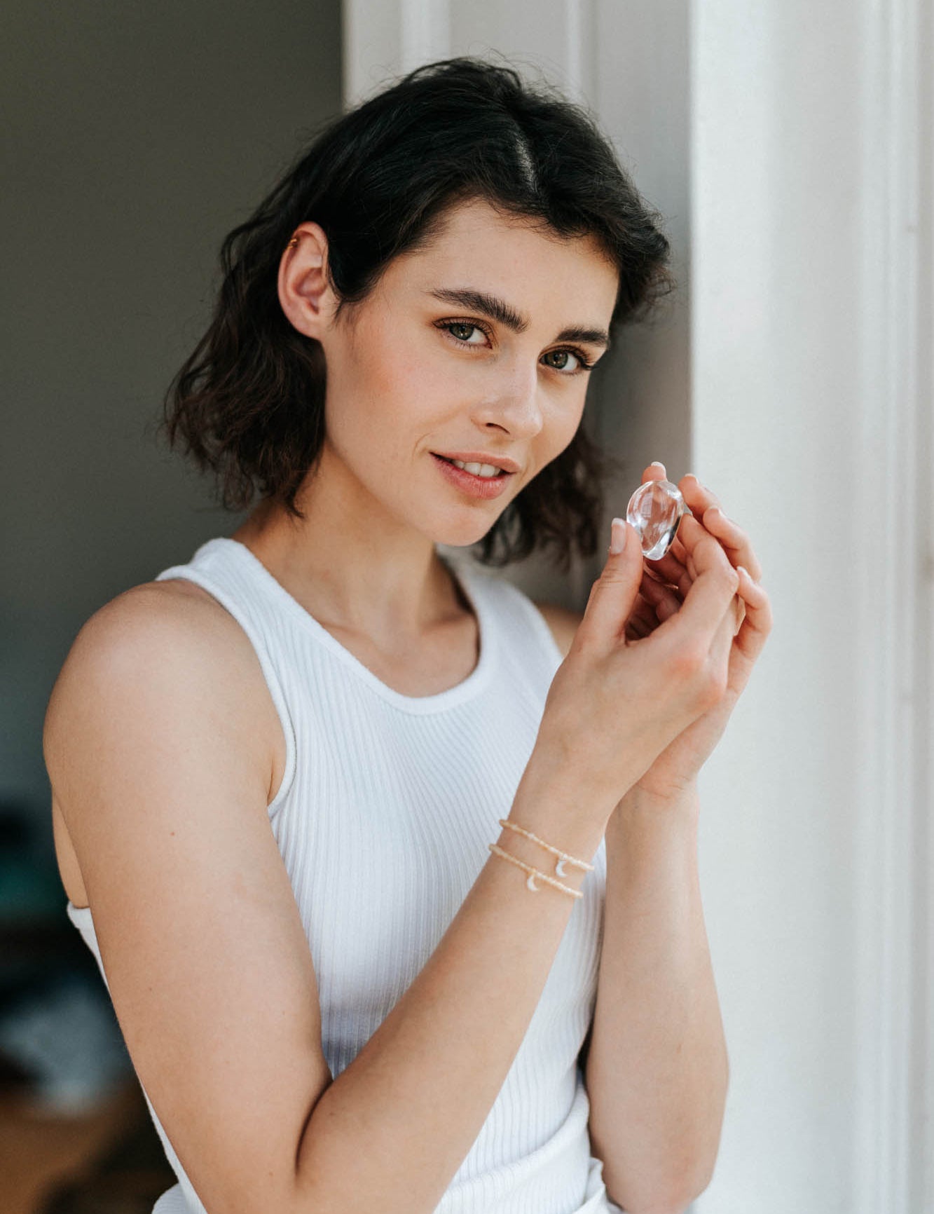 Halte deinen Kristall in der Hand oder platziere ihn auf deinem Körper. So kannst du dich leichter zentrieren, zur Ruhe kommen oder innere Klarheit finden.