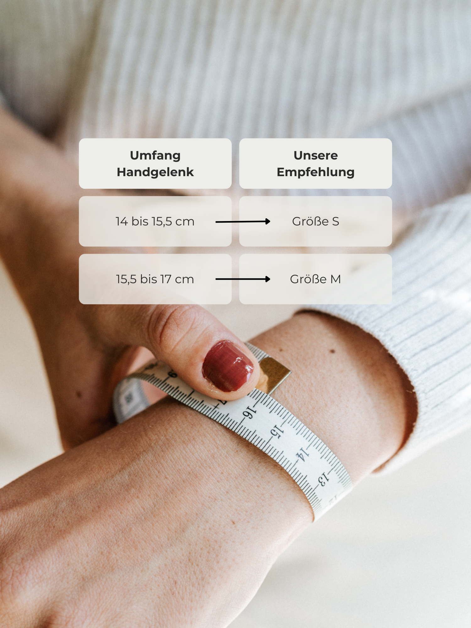 Unsere Armbänder sind auf einen durchschnittlichen Handgelenksumfang abgestimmt und verfügen über elastische Bänder für einen bequemen Sitz. Solltest du eine individuelle Größe benötigen, kannst du dir diese über unseren Armband-Konfigurator anfertigen lassen.