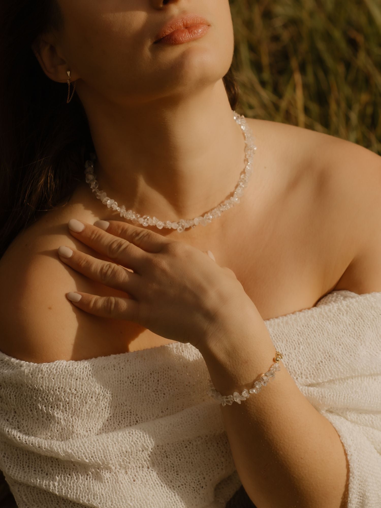 Leicht, clean und vielseitig: Dieses Piece lässt sich mühelos layern, aber auch solo tragen und wirkt dabei immer zeitlos und edel. Der Bergkristall steht für Klarheit und Fokus und genau dieses Gefühl transportiert auch die Ästhetik der Kette: reduziert, kraftvoll, effortlessly chic.