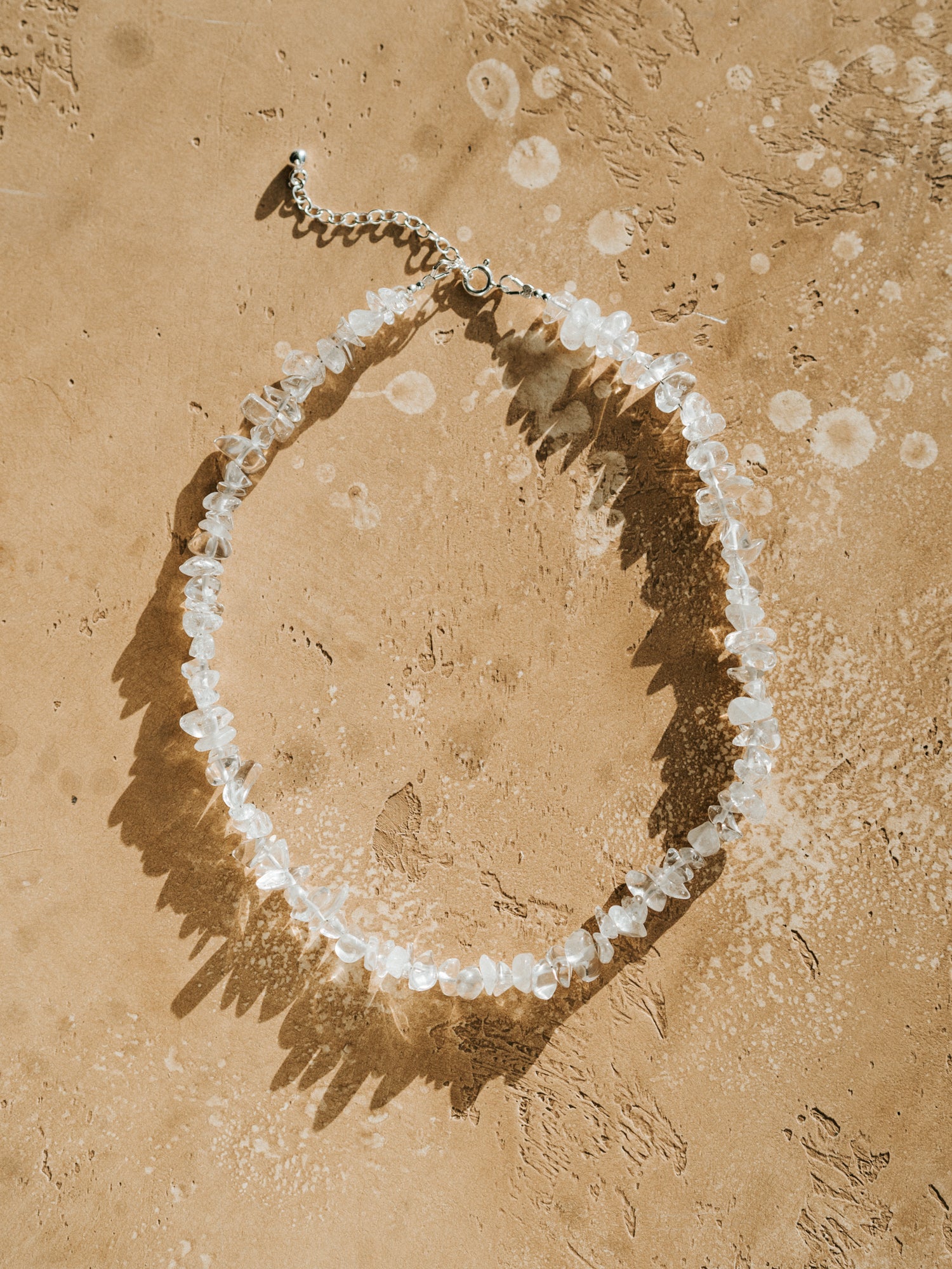 Die Glacier Kette bringt die klare, kühle Schönheit des Bergkristalls in eine moderne, minimalistische Form. Die fein geschliffenen Splitterperlen wirken wie gefrorenes Licht und reflektierten einen subtilen Schimmer, der an Gletscherkanten im Sonnenlicht erinnert.