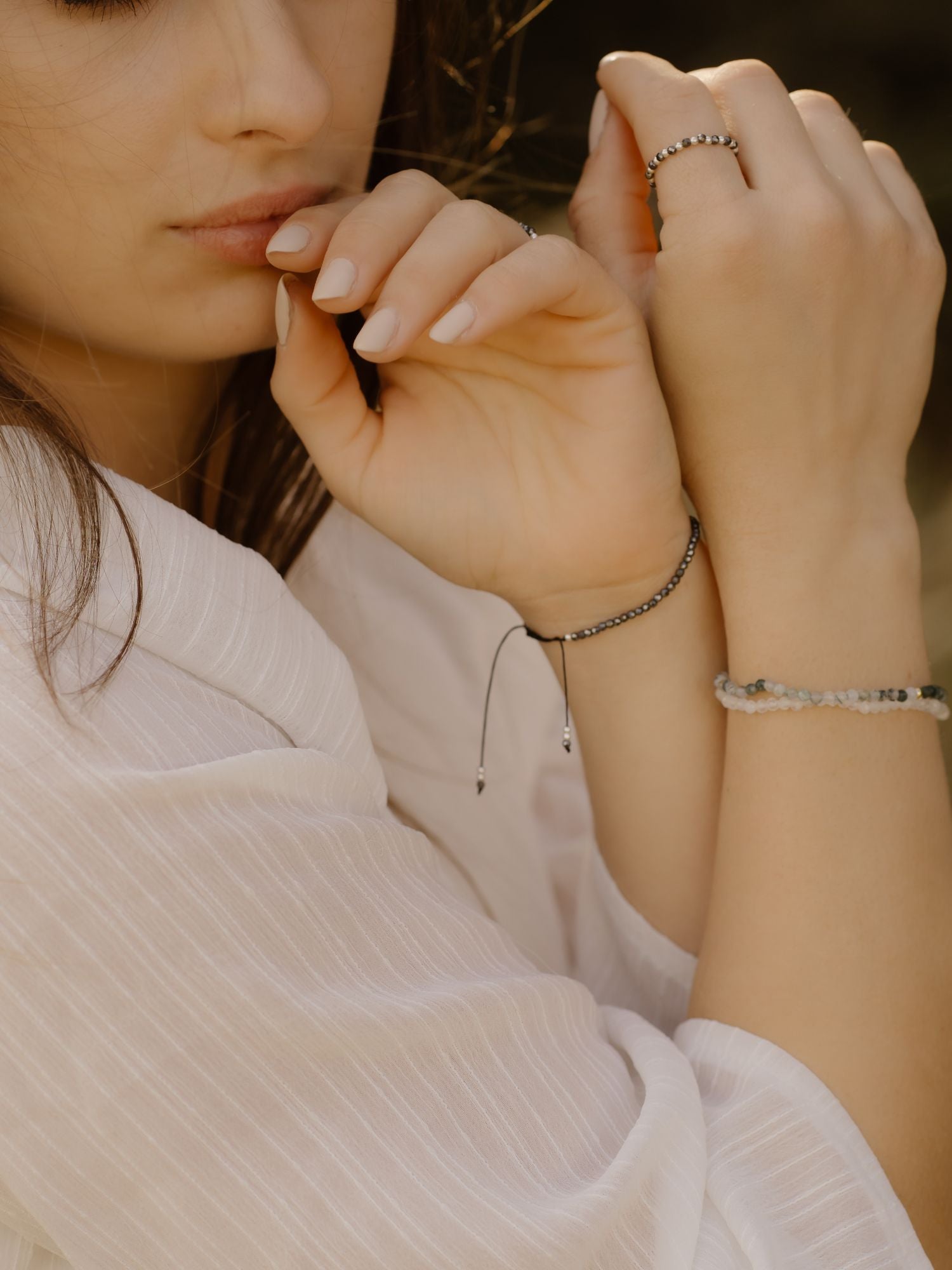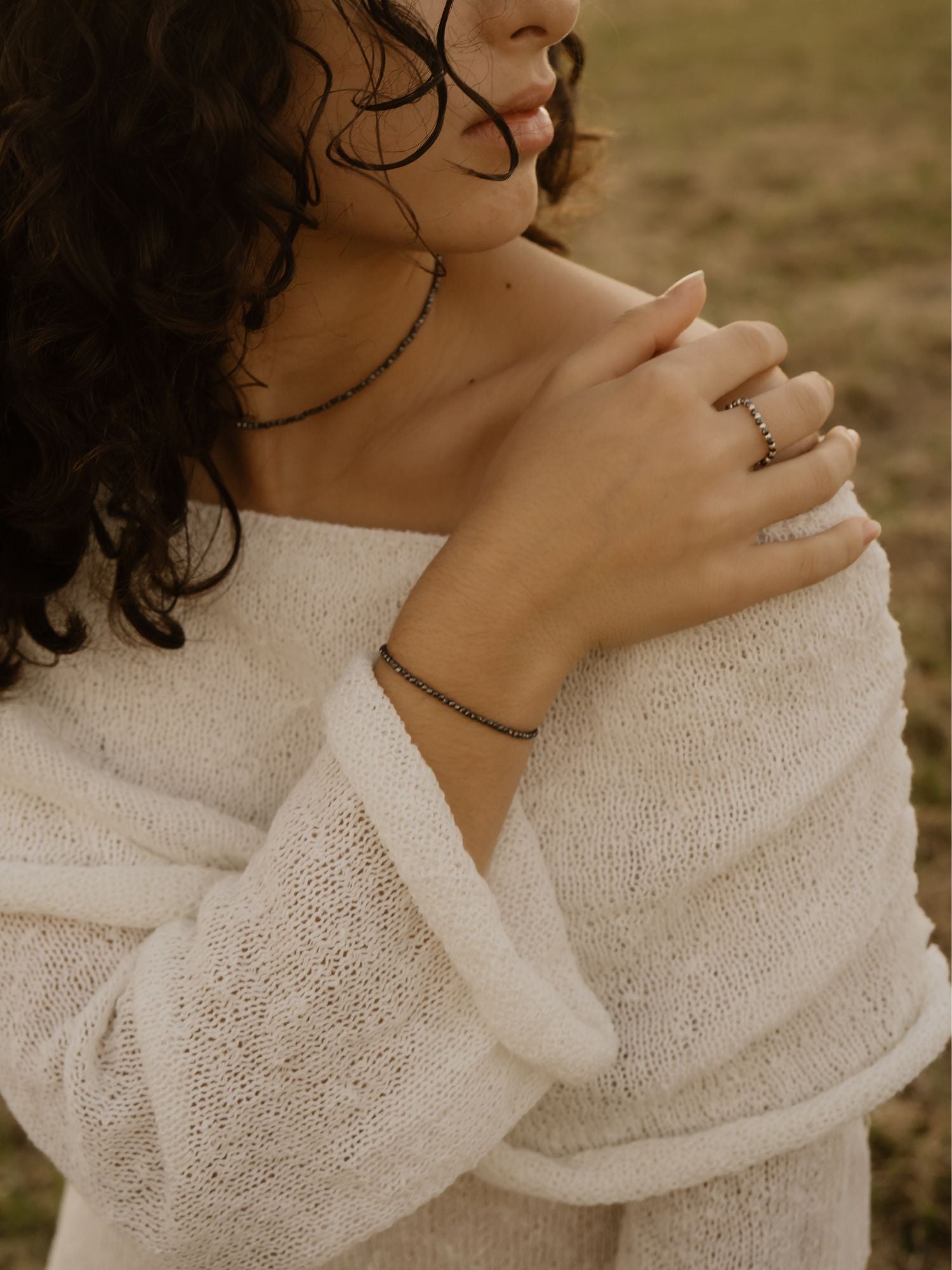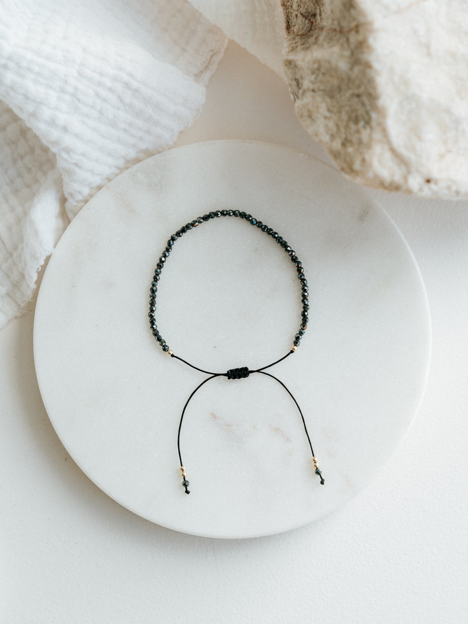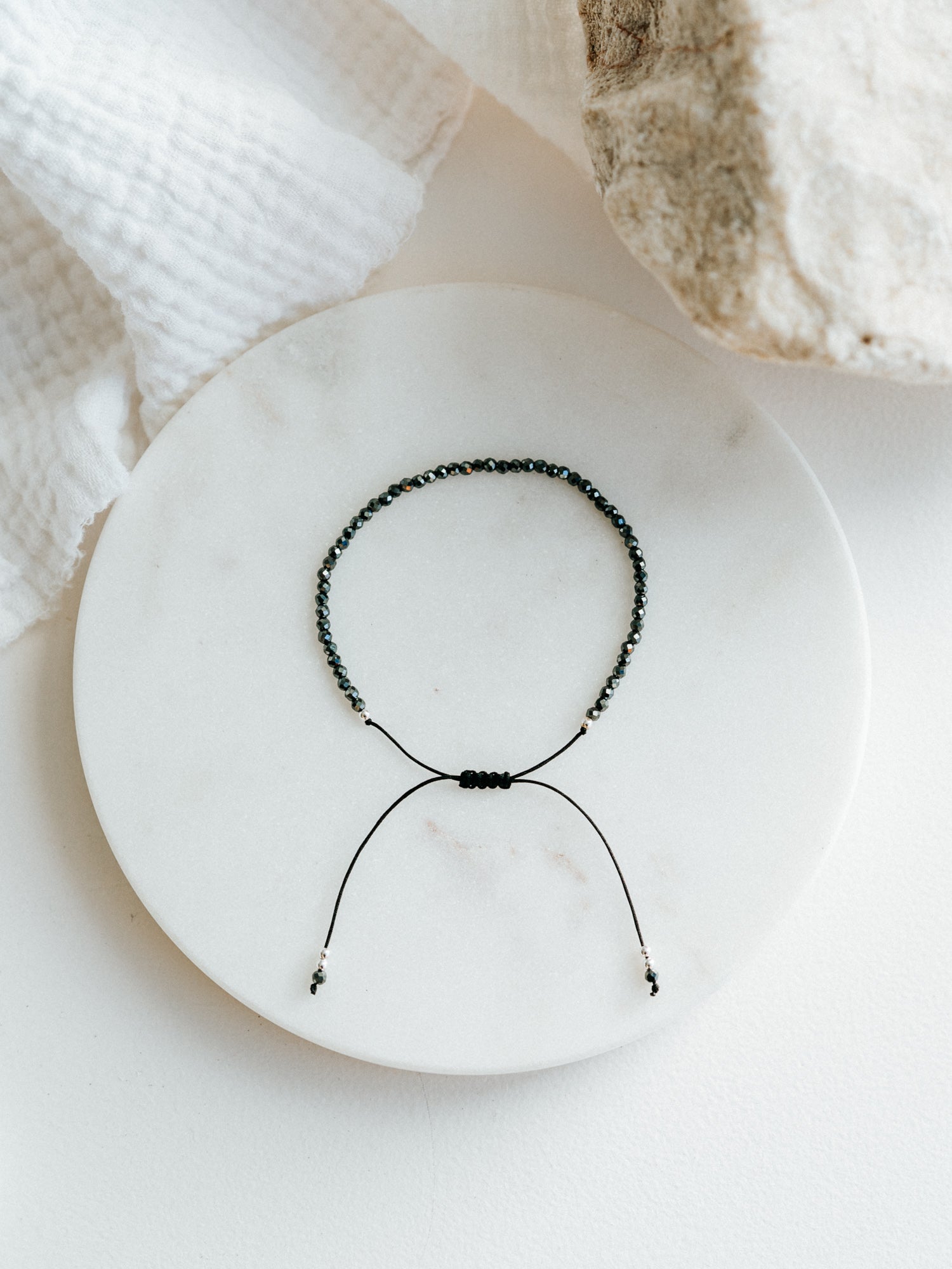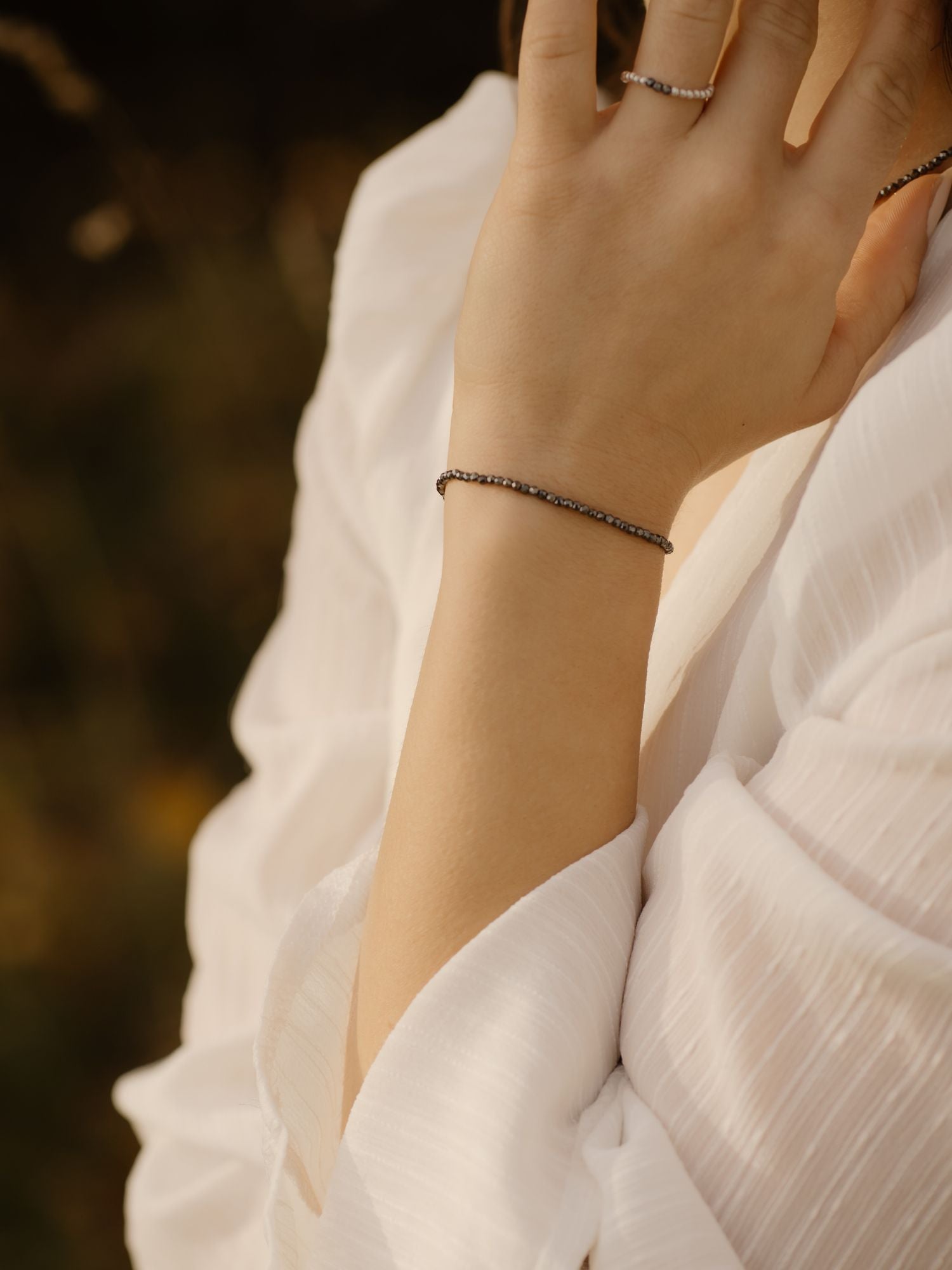 Das Midnight Edge Armband verbindet den schönen Glanz der Hämatitperlen mit einem minimalistischen Look. Die facettierten 2-mm-Perlen fangen das Licht auf eine subtile, fast metallische Art ein - wie der stille Glanz dunkler Felsen im Mondlicht.