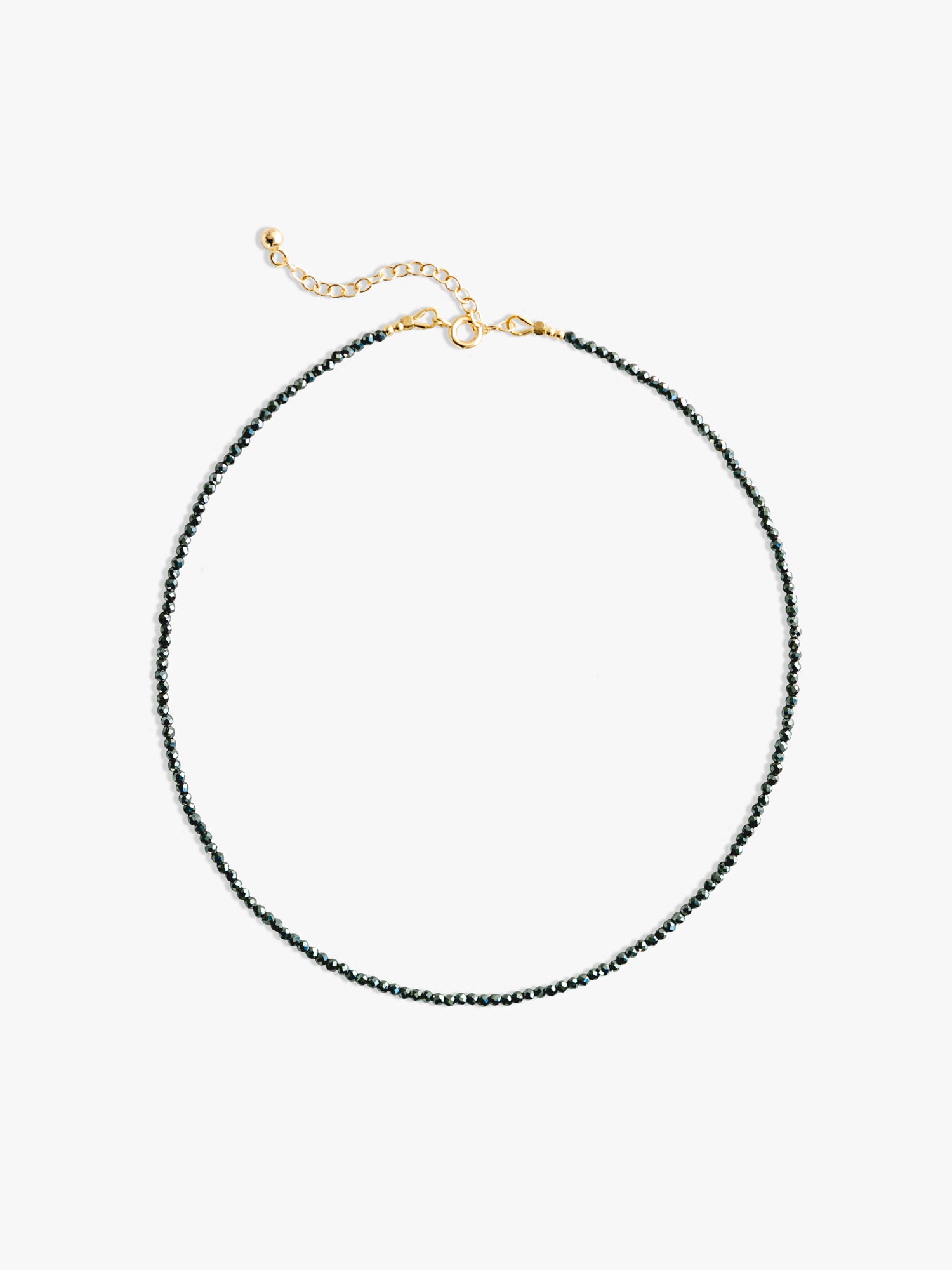 Die Midnight Edge Kette verbindet den minimalistischen Look feiner Hämatitperlen mit einer modernen Ausstrahlung. Die facettierten 2-mm-Perlen fangen das Licht auf eine subtile, fast metallische Art ein - wie der stille Glanz dunkler Felsen im Mondlicht.