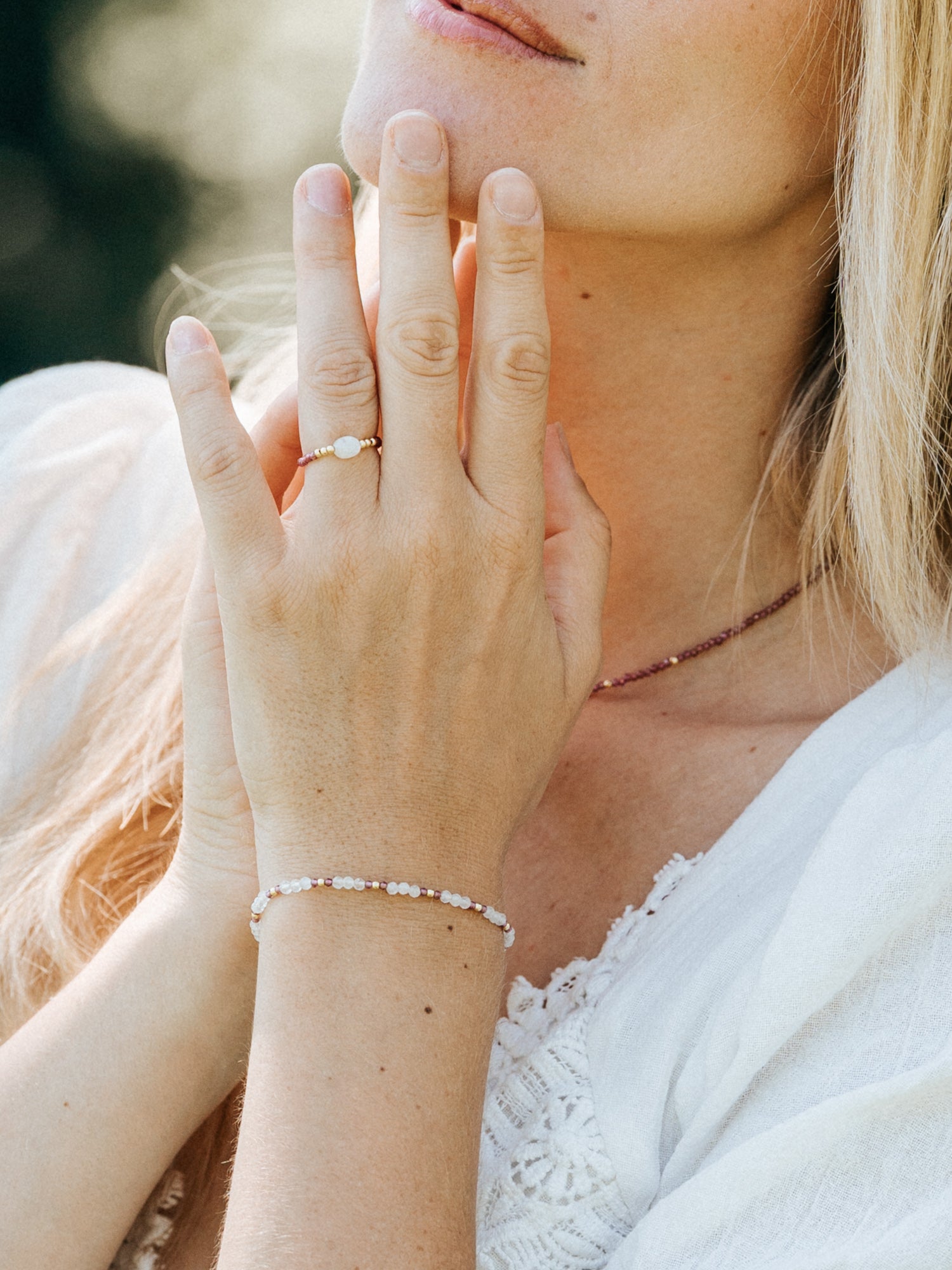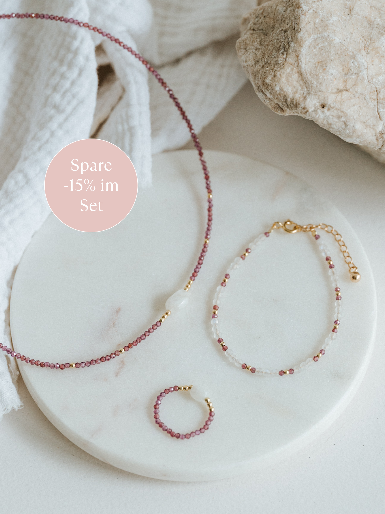 Everbloom ist eine Ode an dein inneres Erblühen. An die Kraft, die sanft in dir wächst und mit jedem Atemzug größer wird. Diese Kollektion verbindet zarte Kristallenergie mit femininen Farben und Designs. Jedes Schmuckstück ist wie ein kleiner Begleiter, der dich daran erinnert, wer du wirklich bist: ein Wunder in ständiger Entfaltung.