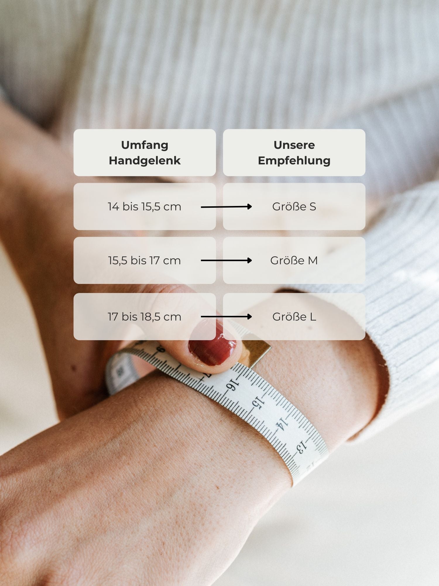Unsere Armbänder gibt es in zwei Größen. Diese sind auf einen durchschnittlichen Handgelenksumfang abgestimmt und verfügen über elastische Bänder für einen bequemen Sitz. Wir empfehlen Größe S (16 cm lang) bei einem Handgelenksumfang von 14 bis 15,5 cm. Und Größe M (17,5 cm lang) bei einem Handgelenksumfang von 15,5 bis 17 cm.