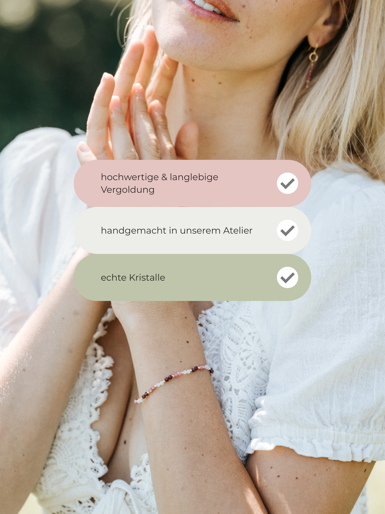 Everbloom ist eine Ode an dein inneres Erblühen. An die Kraft, die sanft in dir wächst und mit jedem Atemzug größer wird. Diese Kollektion verbindet zarte Kristallenergie mit femininen Farben und Designs. Jedes Schmuckstück ist wie ein kleiner Begleiter, der dich daran erinnert, wer du wirklich bist: ein Wunder in ständiger Entfaltung.
