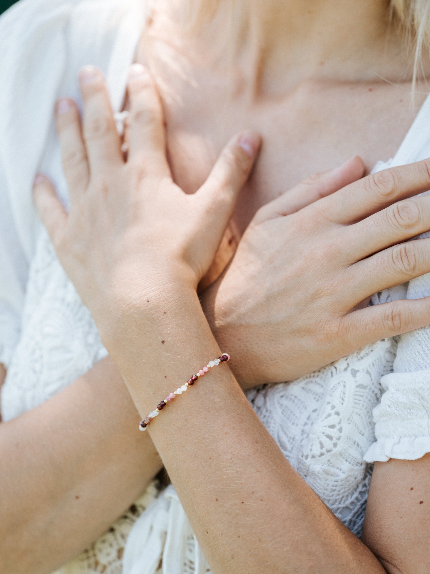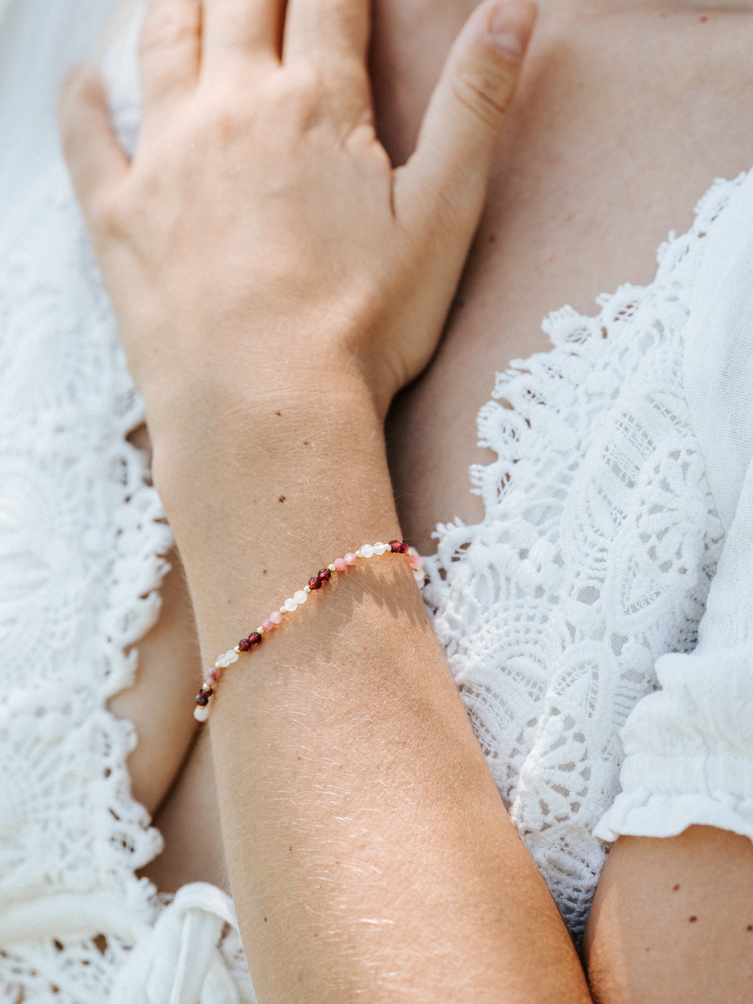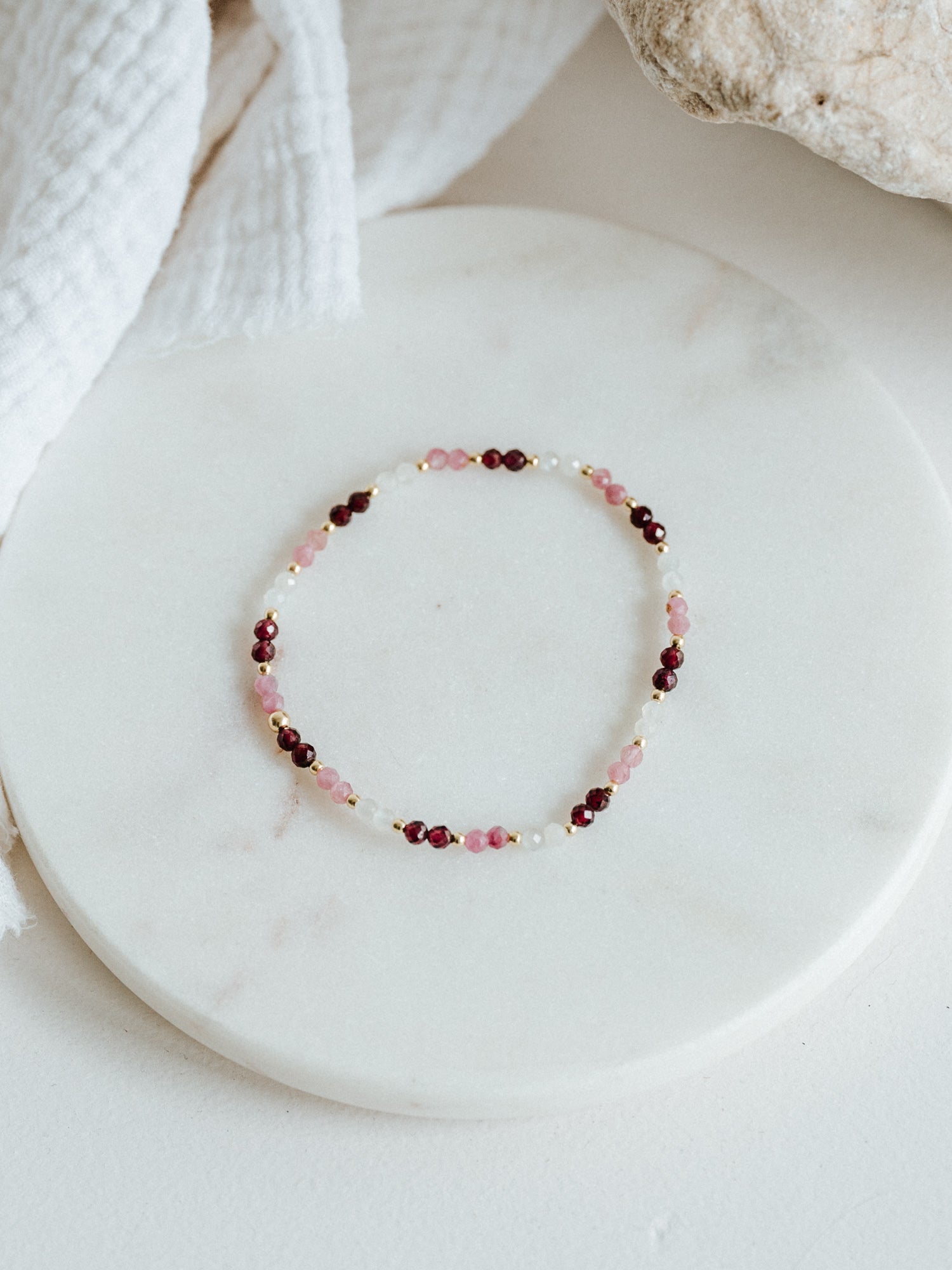 Das Rosie Armband vereint Weißer Mondstein, Rosa Turmalin und Granat. Eine Kombination, die für Selbstannahme, emotionale Stärke und lebendige Energie steht. Wie eine stille Umarmung an dein Herz und all die Facetten, die dich ausmachen.